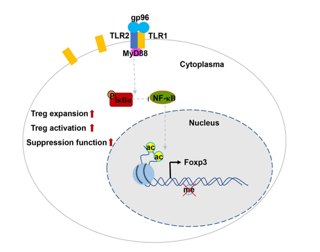 中国科学院微生物研究所孟颂东课题组二十多年来致力于热休克蛋白gp96的免疫调控机制、分子伴侣功能研究和自身免疫性疾病药物研发。已有一些证据表明,自身免疫性疾病发病病因是由于机体调节性T细胞(Treg)数量减少或功能减弱导致的免疫系统失衡。我们前期研究发现小鼠免疫高剂量gp96可显著增加Treg的比例、增殖能力和抑制功能,从而缓解系统性红斑狼疮等自身免疫疾病。通过基因表达谱分析发现NF-κB通路中p65和c-Rel是gp96增强Treg中Foxp3表达的关键转录因子,我们还构建了与Toll样受体(TLRs)结合部位的突变体gp96、TLR2敲除小鼠和Treg细胞特异性缺失MyD88小鼠,均证明gp96是通过TLR2-MyD88介导的NF-κB信号通路激活了Treg细胞并诱导Foxp3表达。
