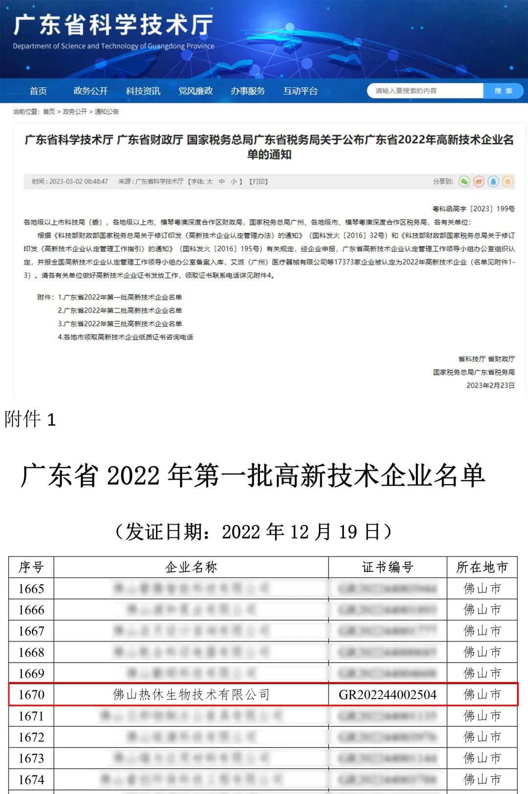 近日,佛山热休生物技术有限公司(下称“热休生物”)荣获由广东省科学技术厅、广东省财政厅、国家税务总局广东省税务局联合颁发的《高新技术企业证书》,获得国家“高新技术企业”认证!